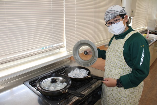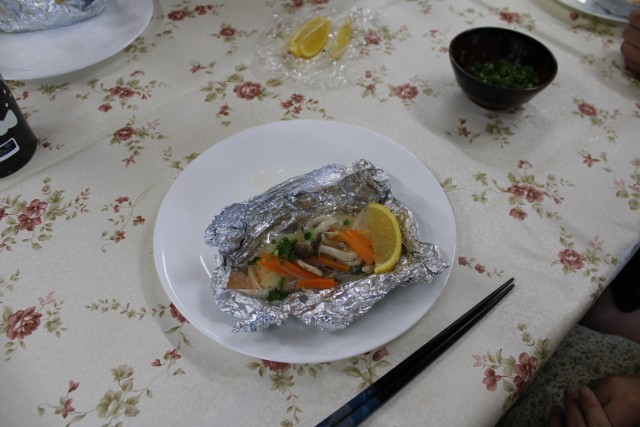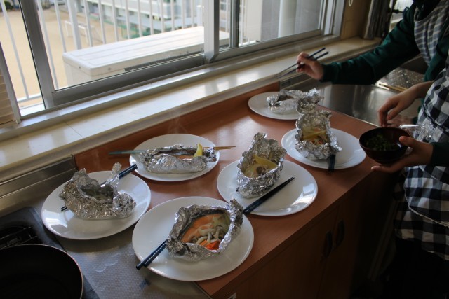 本日から、1学年家庭科で調理実習が始まりました。最初のメニューは、鮭の包み焼きです。