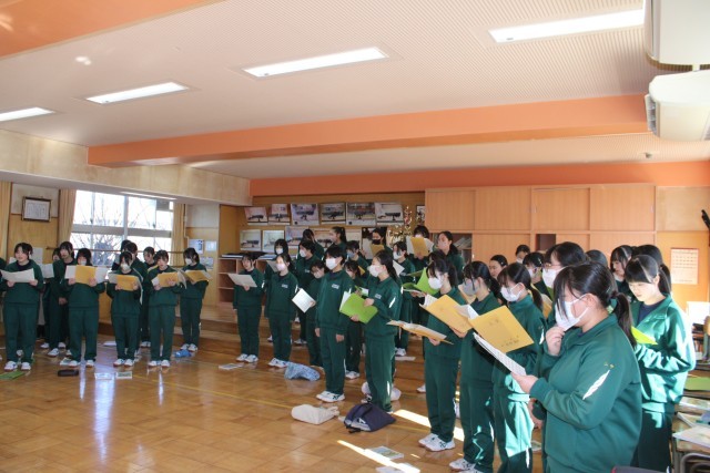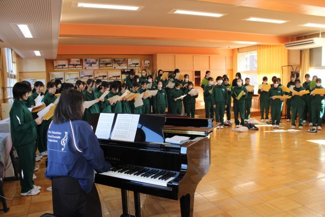 3月13日には卒業式が行われます。その卒業式に向けて、昼休みを利用して1・2年生の式歌の合同練習が始まりました。音楽室で、1、2年生がパートごとに集まり、集中した練習が行われています。感動的な卒業式となるように頑張っています。