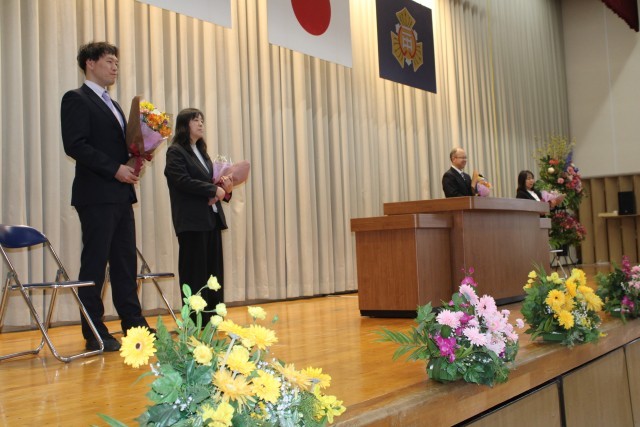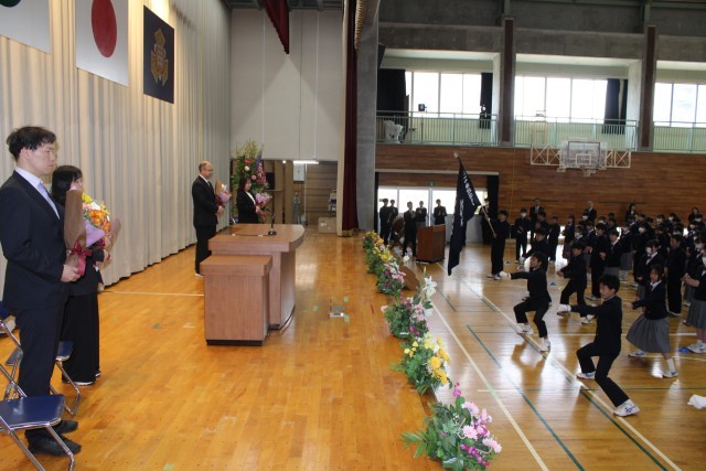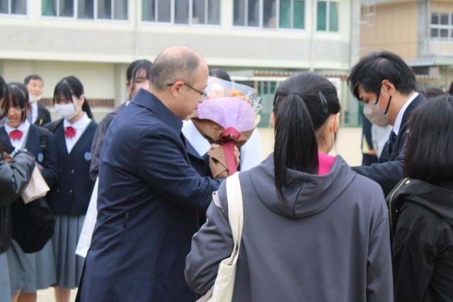 令和7年度末の人事異動により、4名の先生方が転出することになり、本日離任式が行われました。生徒会役員一人一人からお別れの言葉が述べられ、花束が贈呈されました。また、応援団によるエールも行われ、全校生徒で感謝の気持ちを伝えました。4名の先生方、本当にありがとうございました。