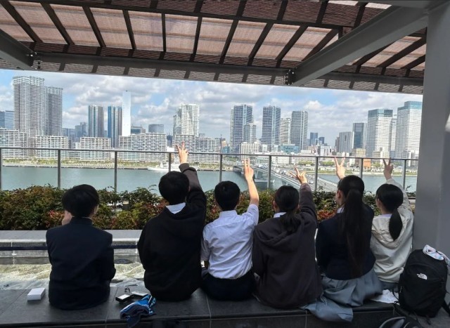 東京都内の班別自主研修がスタートしました。足湯につかりながら、東京都内を一望しています。
