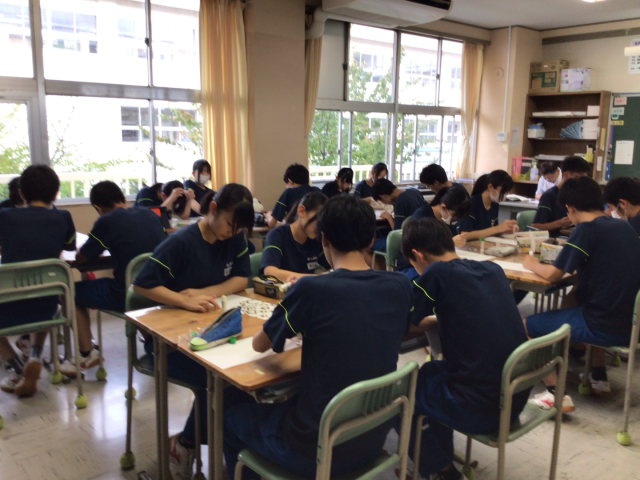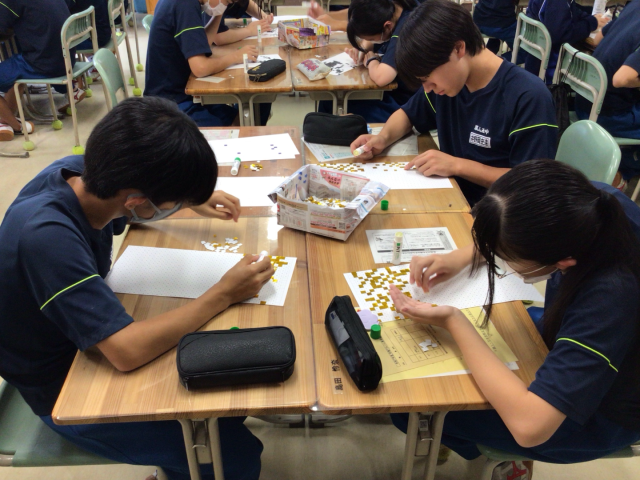 今年度も桜木祭恒例のモザイクアートに全校生で取り組みます。実行委員が準備をしたマス目に色紙を丁寧に貼り付けていきますが、残念ながらこの時点ではどんな絵が出来上がるかわかりません。ぜひ本番のお披露目をご期待ください。