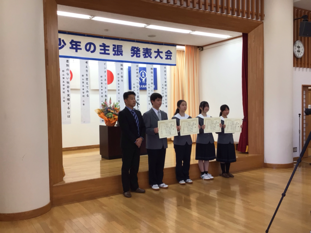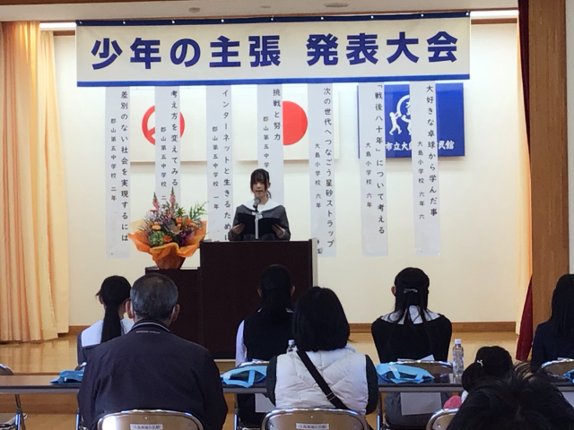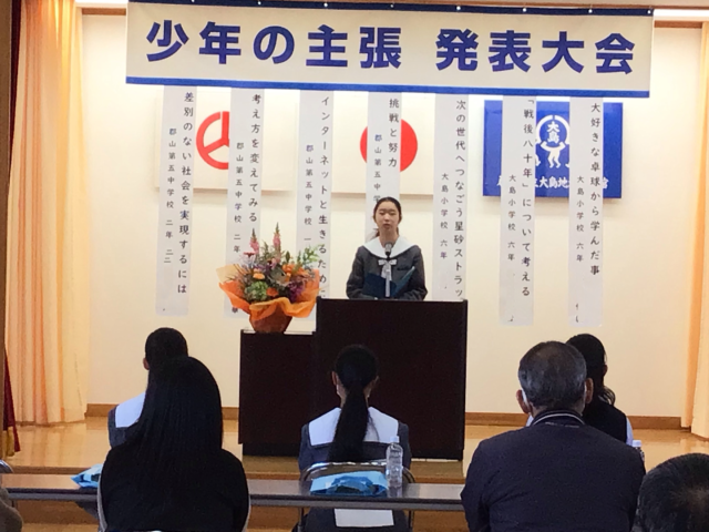 桃見台地区、赤木地区に引き続き、11月15日(土)に大島地区において、「少年の主張」作文発表が行われました。本校からは4名の代表者が参加しました。