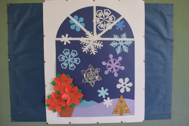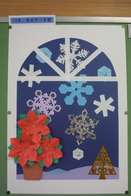 初雪が降り、銀世界の朝を迎えました。さくらぎ学級の生徒が作成した作品、12月「冬のアーチ窓」です。校長室と事務室脇に掲示しましたのでぜひご覧ください。