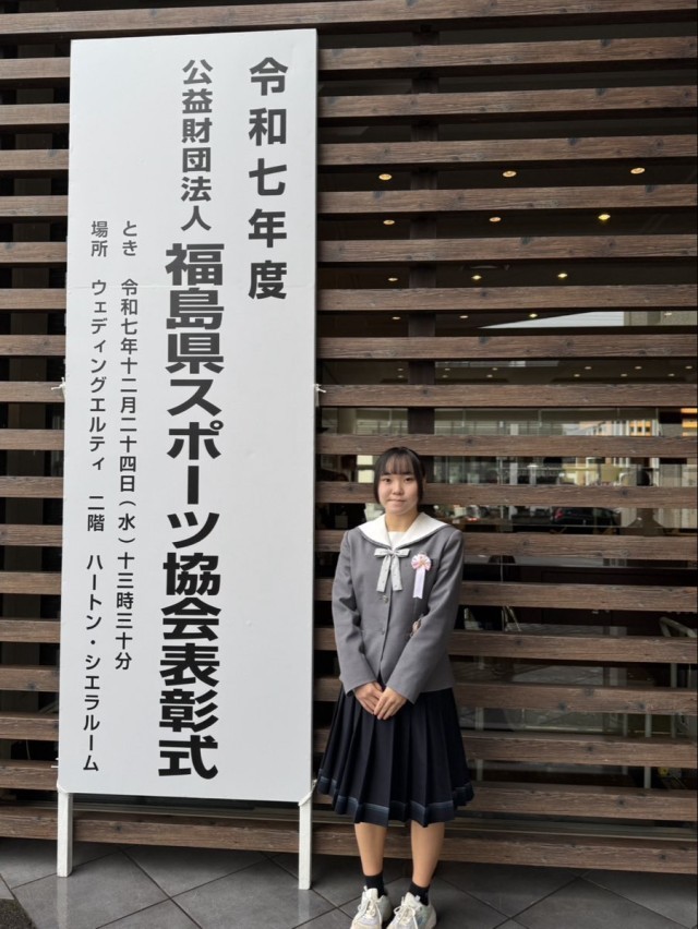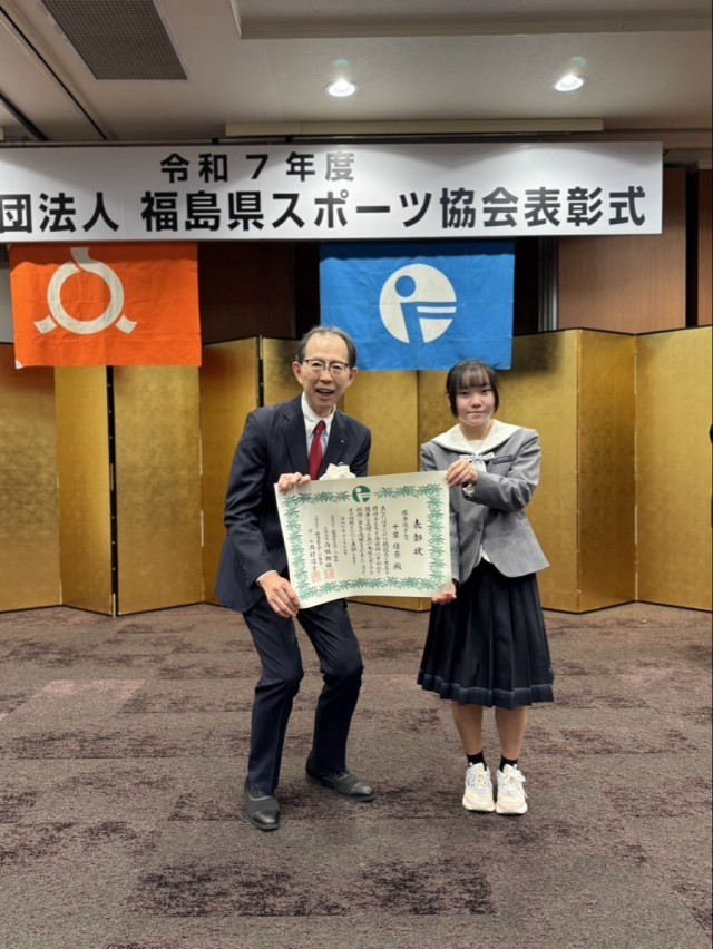 24日(土)、福島市において令和7年度公益財団法人福島県スポーツ協会表彰式が行われ、飛込競技の千葉優奈さんが3年連続で表彰されました。表彰式後には、内堀知事との記念撮影や懇談が行われました。