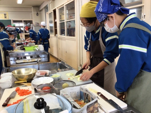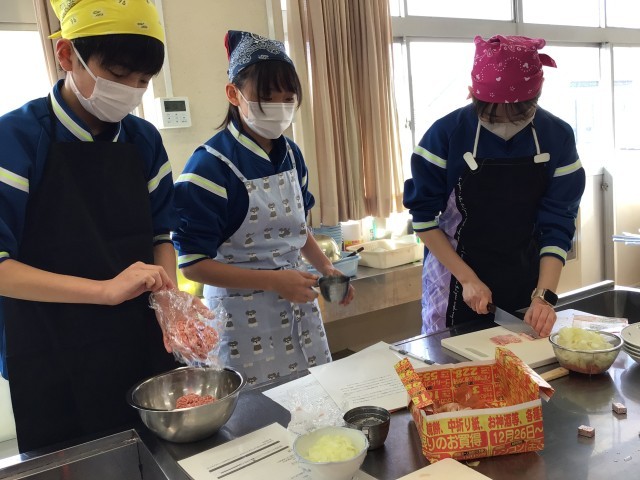 一学年最後の調理実習が行われました。メニューは、ハンバーグとミネストローネ。「玉ねぎで目が痛い!」などと言いながらも、班のメンバーみんなで協力し、楽しそうに調理していました。