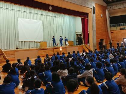 今日の全校集会は生徒会役員が中心となり、各委員会の活動内容と、委員会からのお願いなどを発表しました。