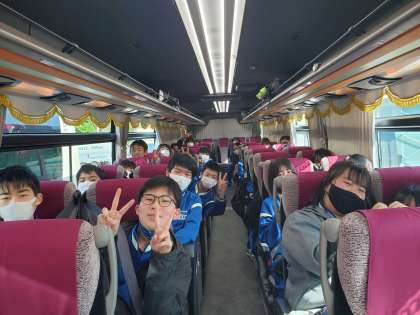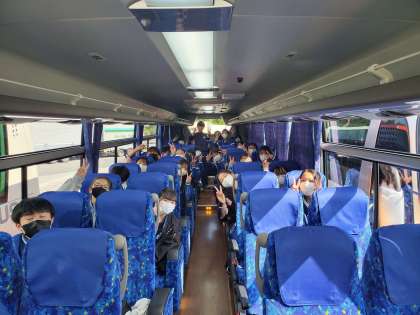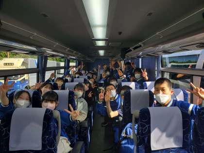 上河内サービスエリアでの各学級のバスの中の様子です。暑くなってきました。みんな笑顔です。2組、3組、4組です。