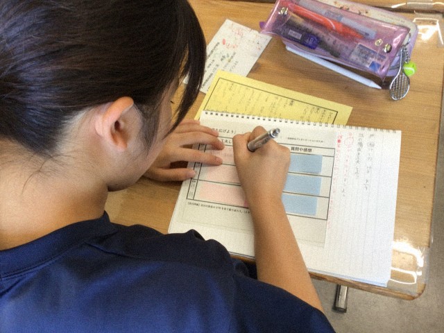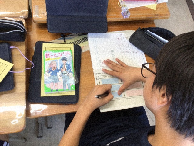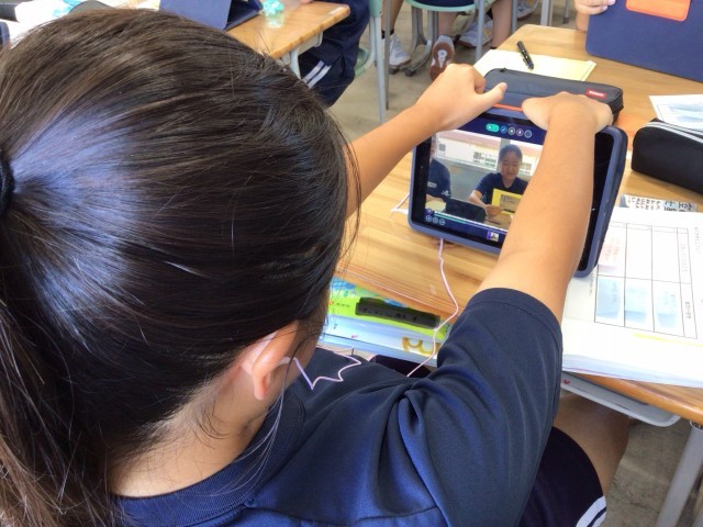 4人一班の構成で、班内で一人一人お気に入りの本についてプレゼンテーションしました。発表者の工夫していた点や質問・感想などを付箋紙に記入し発表者に渡していました。発表から記入まで全て2分刻みでテンポよく進められました。4人全員終わったところで、班でよかった人一人チャンプを決めました。その後、撮影してもらっていた自分のプレゼンテーションを見直し、よかったところや改善点を具体的に挙げていました。