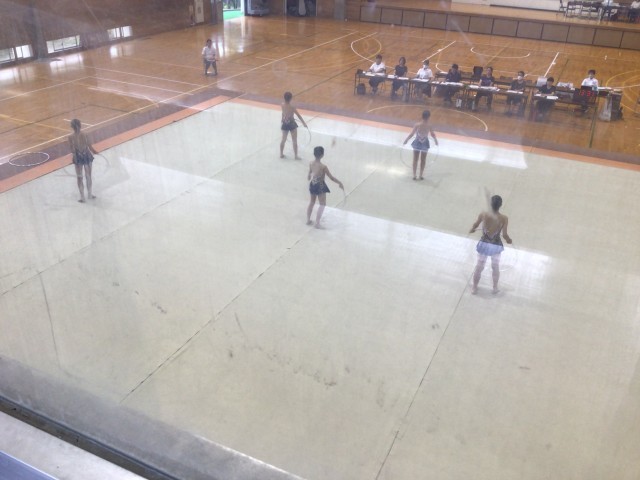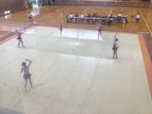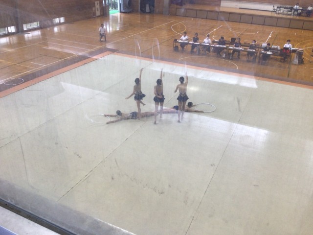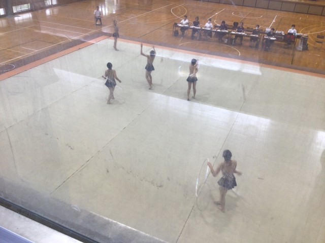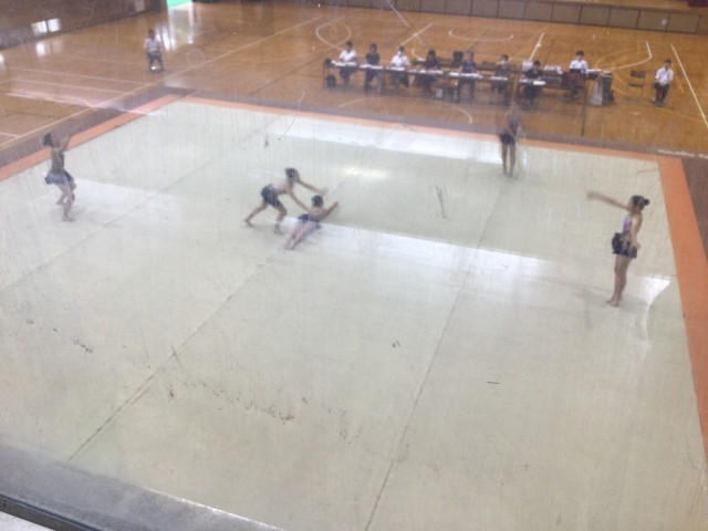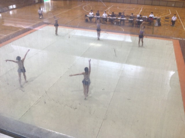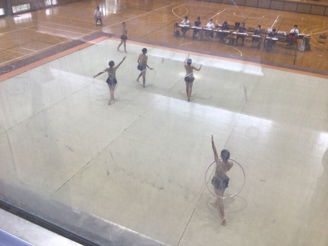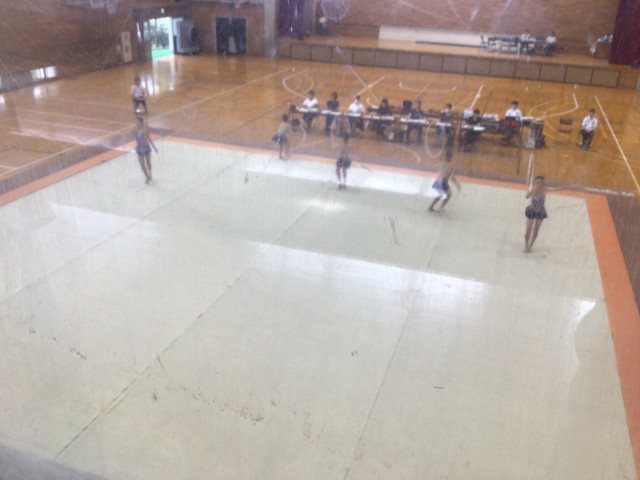 郡山第三中学校において、新体操競技が実施されました。1年生中心のチーム構成でしたが、唯一の2年生が後輩たちをリードしながら演技していました。事前練習では、フープを落とす場面も見られましたが、本番ではしっかり演技することができました。