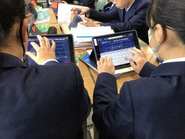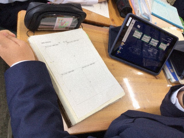 まずは、前時に各自で調べたことをグループ内で確認しました。その後、4人グループでタブレットのロイロノート機能を活用してフィッシュボーン上に発表資料を作成していきました。ロイロノート上でそれぞれ分担協力して資料作成を進めました。資料完成後は、グループごとに前に出てみんなに発表していました。発表を聞いている人たちは、感想や疑問を手早くまとめていました。