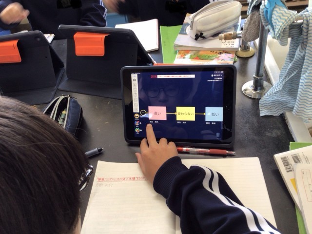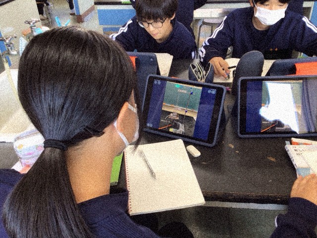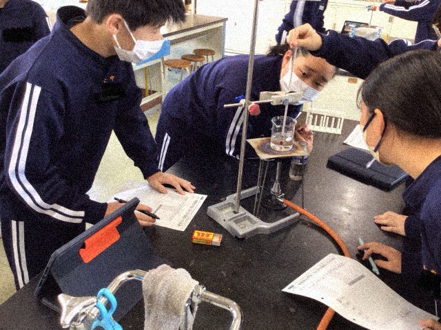 タブレットの画像で実験装置や実験の仕方を確認し、実際に班ごとに実験しました。装置を組み立てる人、ガスバーナーに火ををつける人、計測する人、記録する人等に分担して進めていました。