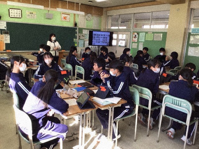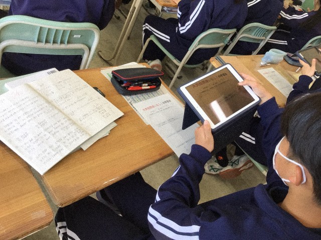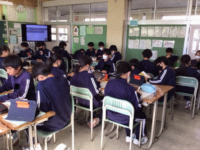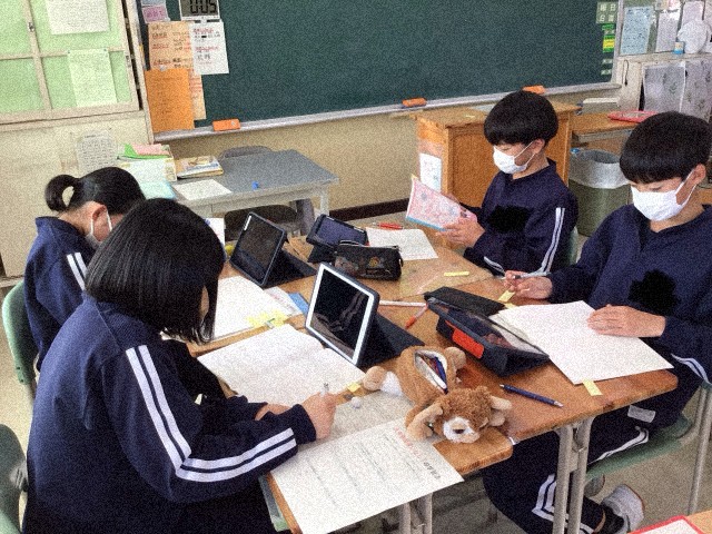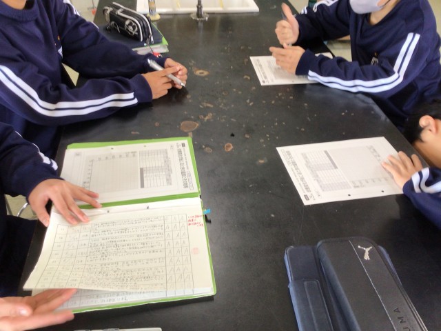 自分の自主学習ノートを見返して、「やってはいけないこと」考えました。それを班で共有した後、全体でも共有しました。次に、全体で確認したことを踏まえて、班内で同じ班員のノートから良いところ書き出して付箋を貼りました。最後に、自分の手元に戻ってきたノートに貼られた付箋紙のコメントをみんな明るく笑顔で読み返していました。