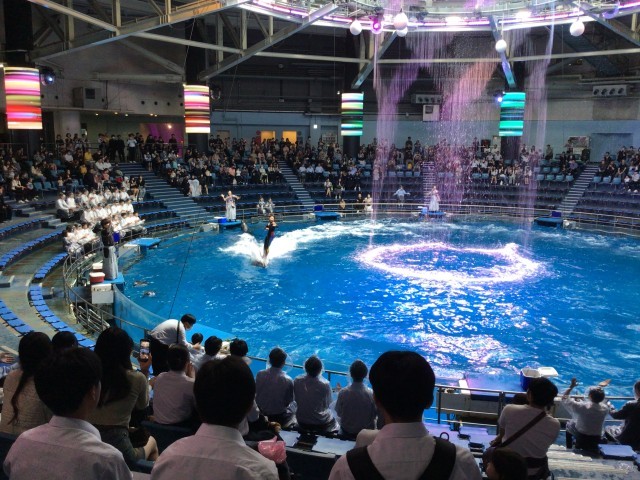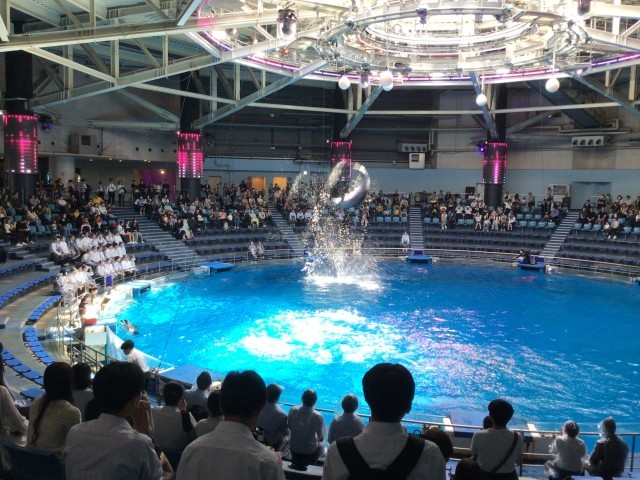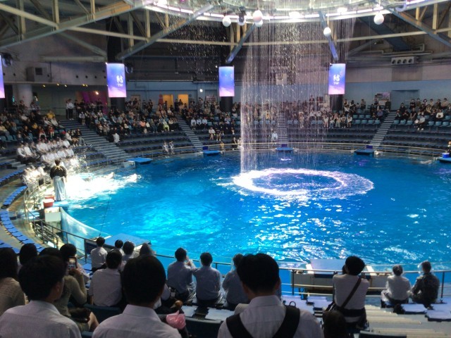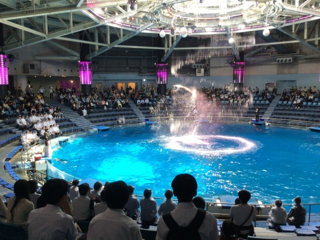 マクセルアクアパーク見学でした。イルカショウでは、前列4列までに座った人たちは、ずぶ濡れになっていました。
